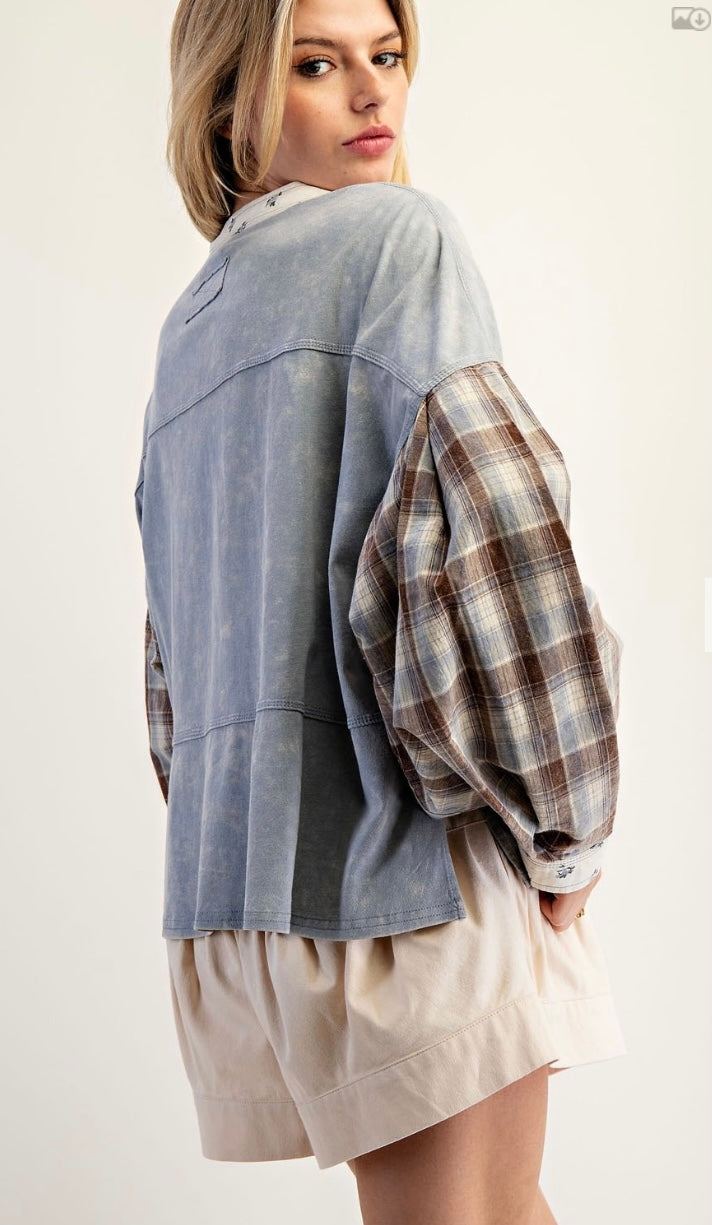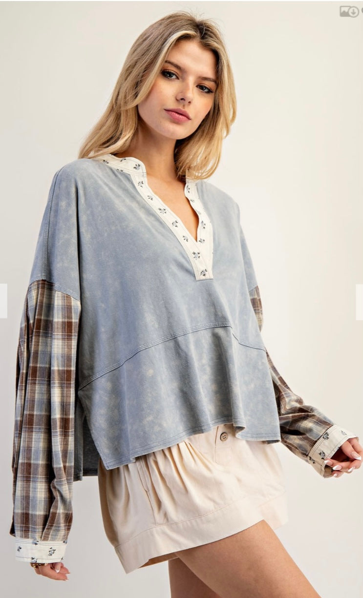 Product Detail: This mixed media long sleeve top features a mineral washed knit bodice with contrast plaid balloon sleeves, floral trim along the split neckline and cuffs, and exposed seam detailing for a vintage inspired, effortlessly layered look.