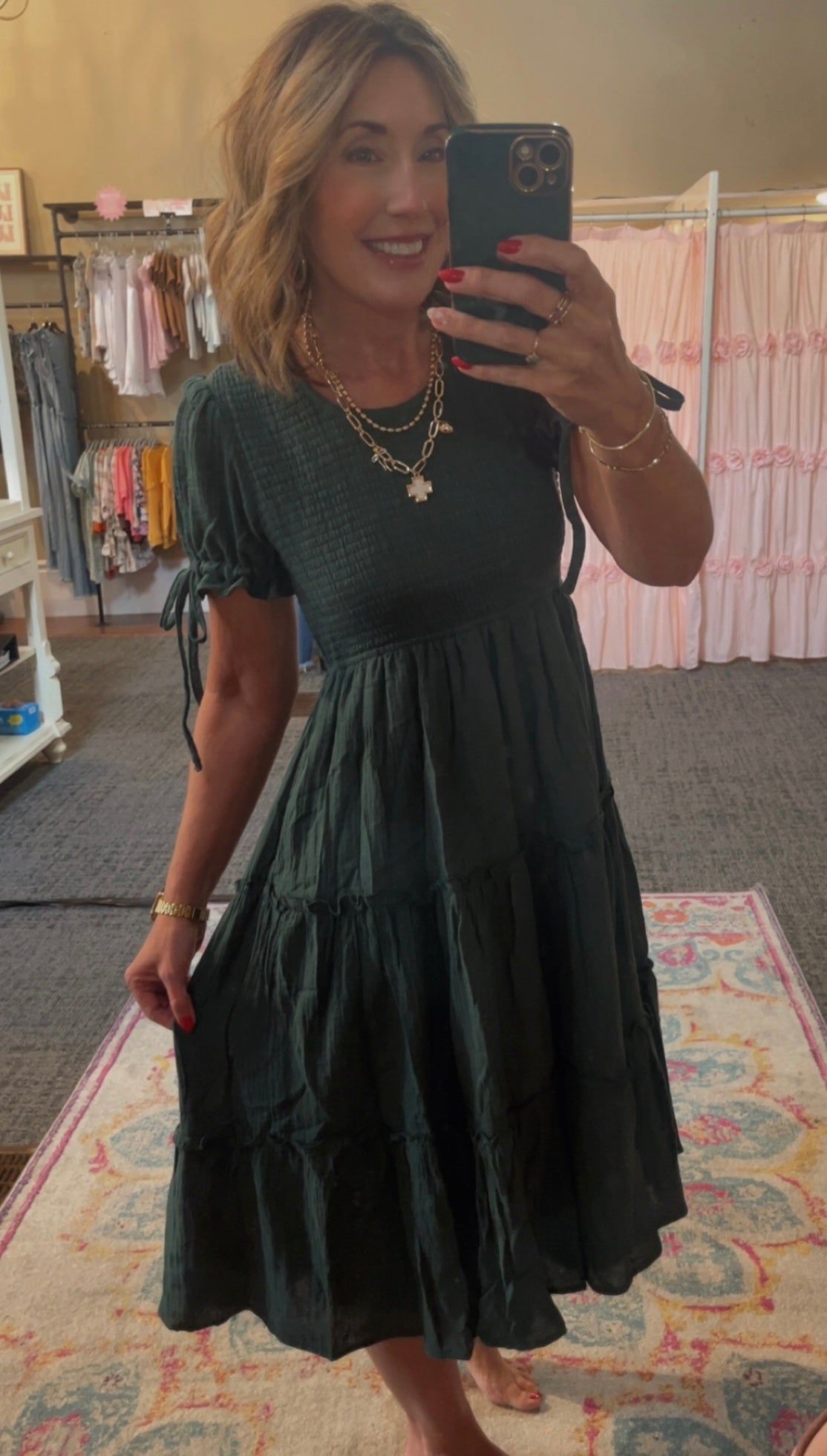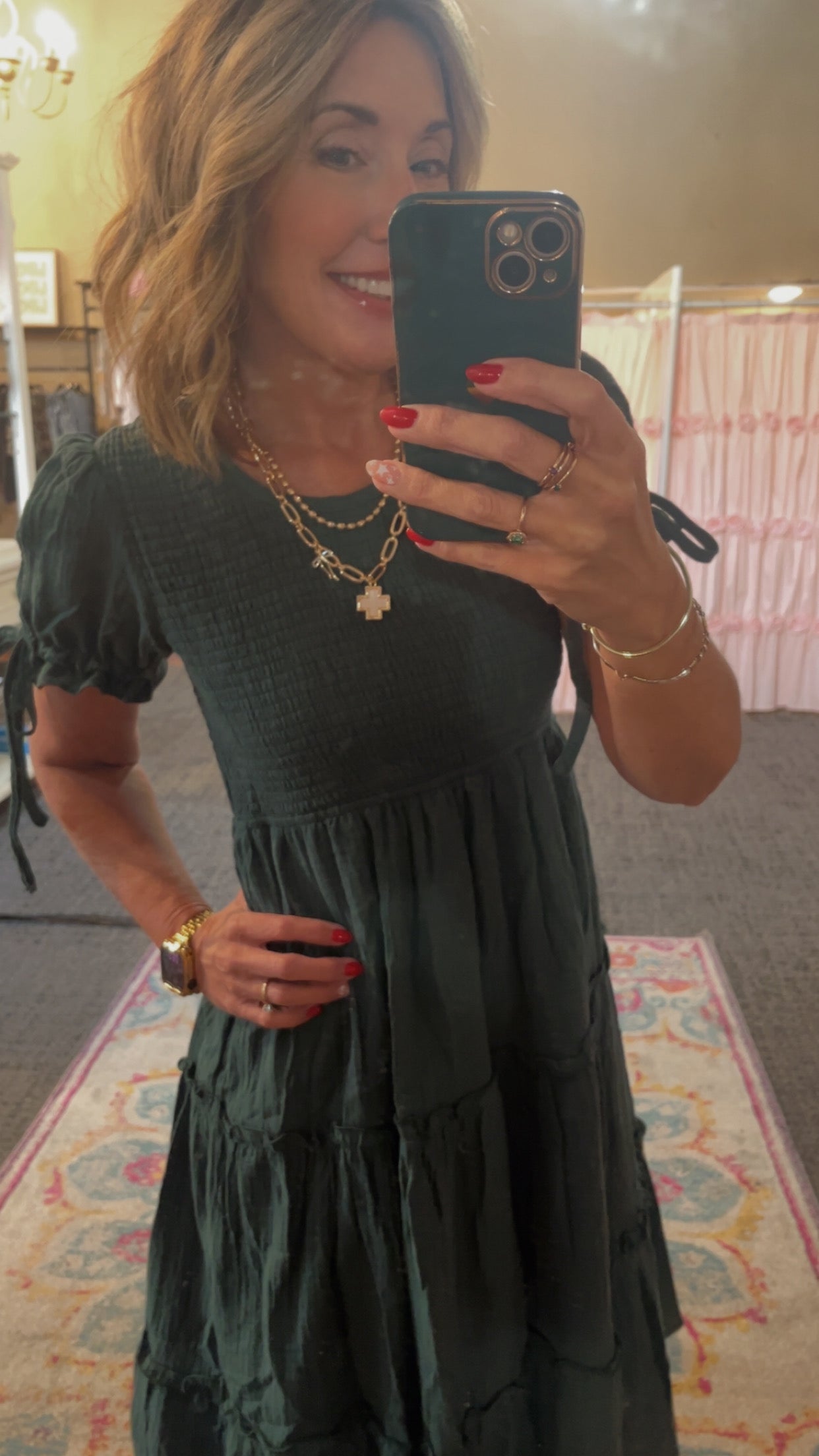 Flowy tiered dress with smocked bodice in a beautiful lagoon green color