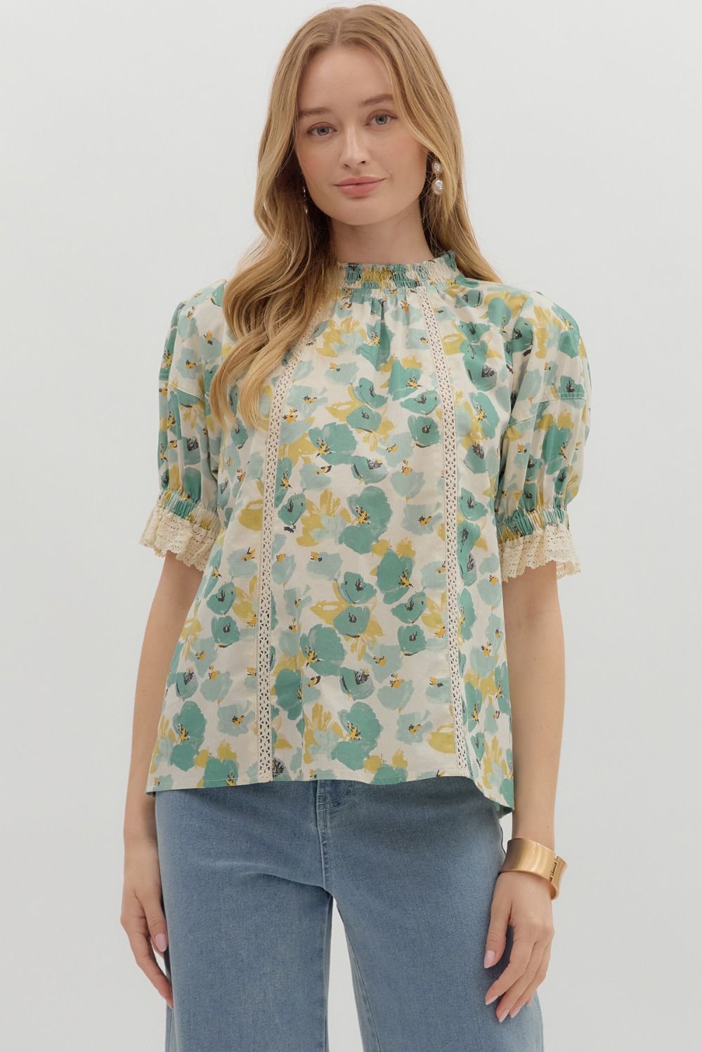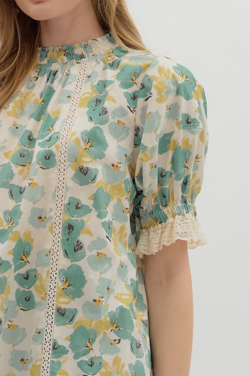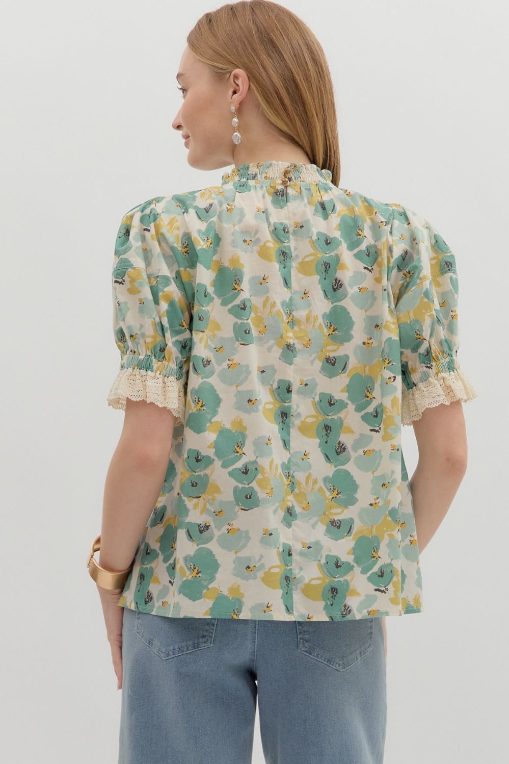 Floral pattern ruffle trim edge short puff sleeve smocked neck band double-button keyhole back closure top featuring trim inset detail. Unlined. Woven. Non-sheer. Lightweight.